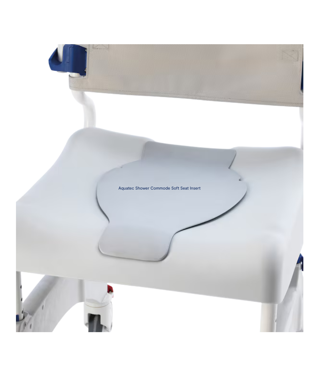 The Aquatec Shower Commode Soft Seat Insert fits securely into the aperture of the Aquatec Soft Seat, allowing the commode to function as a standard chair when hygiene access is not needed. It supports seating versatility while maintaining comfort and stability for the individual.