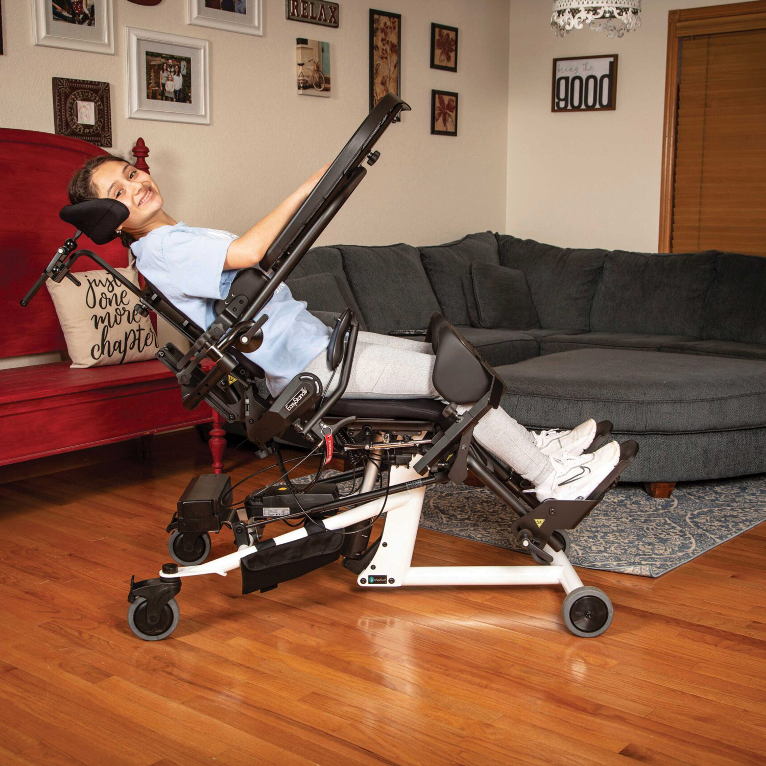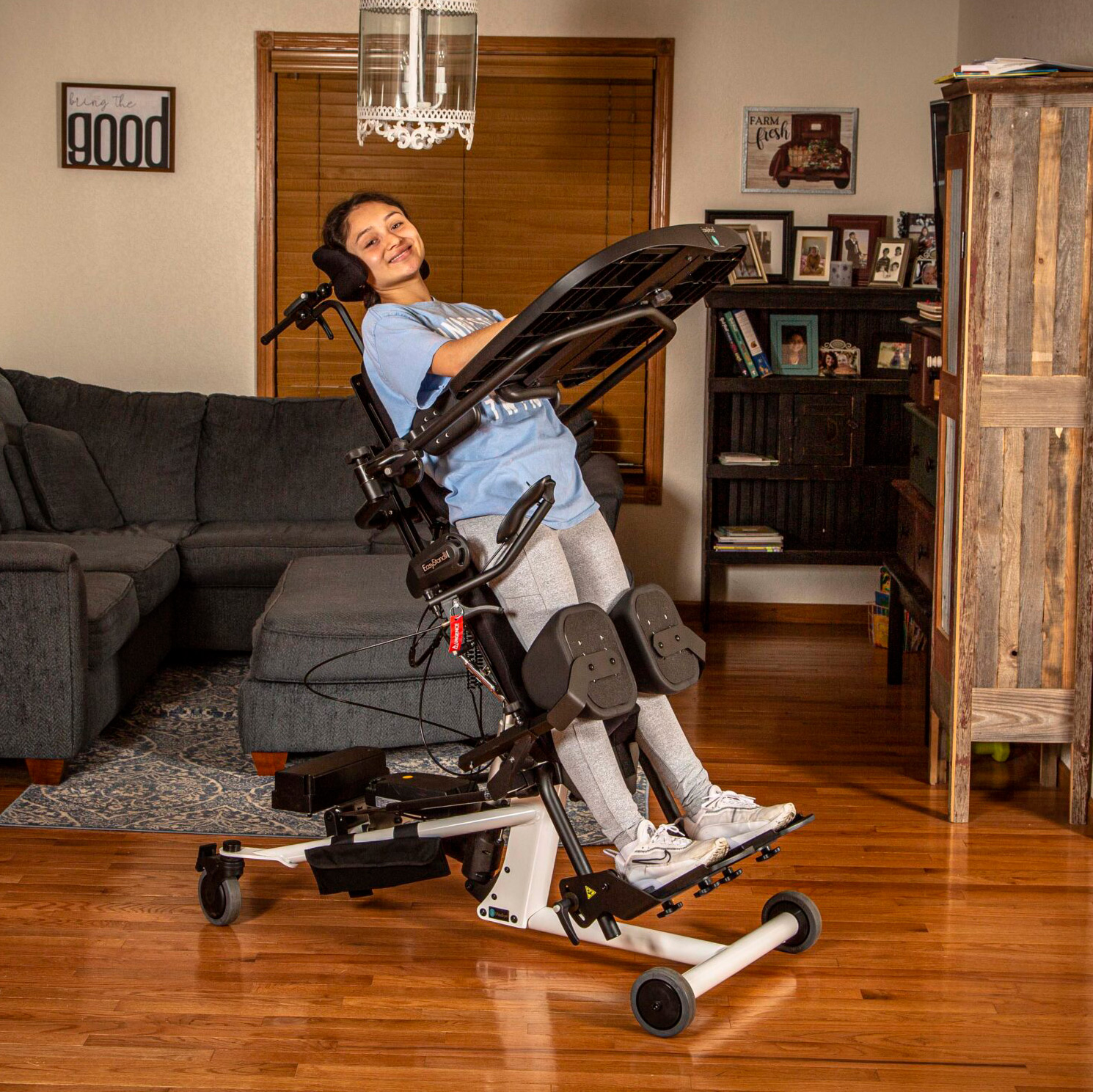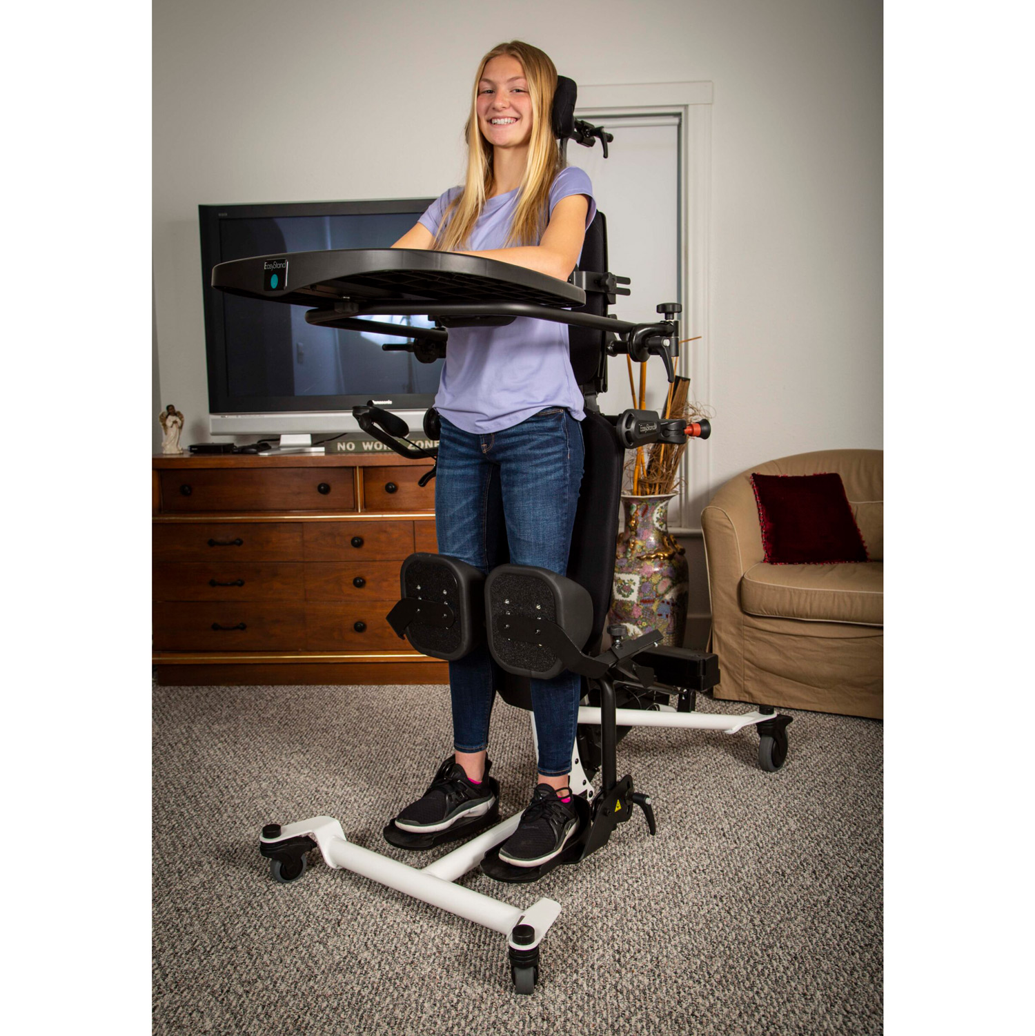 By alternating positions, children can stand for longer periods. The Bantam is also suitable for children with contractures. Many accessories are available for additional postural support.