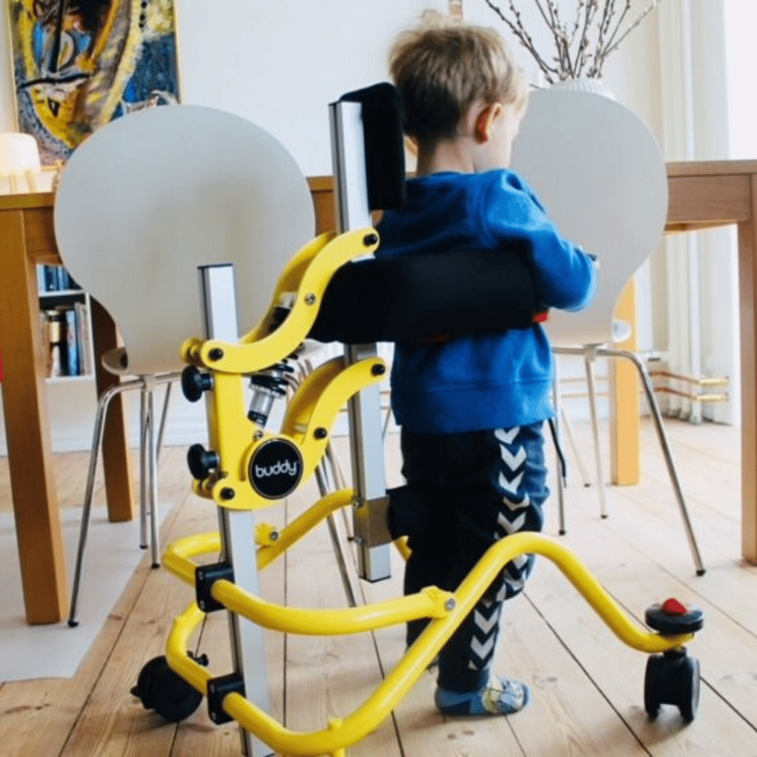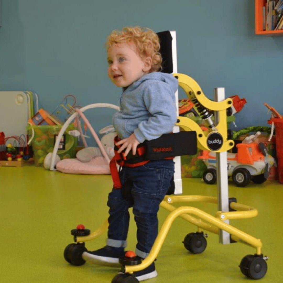 The Buddy Walkabout is a posterior walking aid designed for partial weight-bearing support and mobility. Its ergonomic frame supports the child’s weight, allowing for independent and free movement. Suitable for mild, moderate, and complex needs, it ensures safe and comfortable positioning with features like: