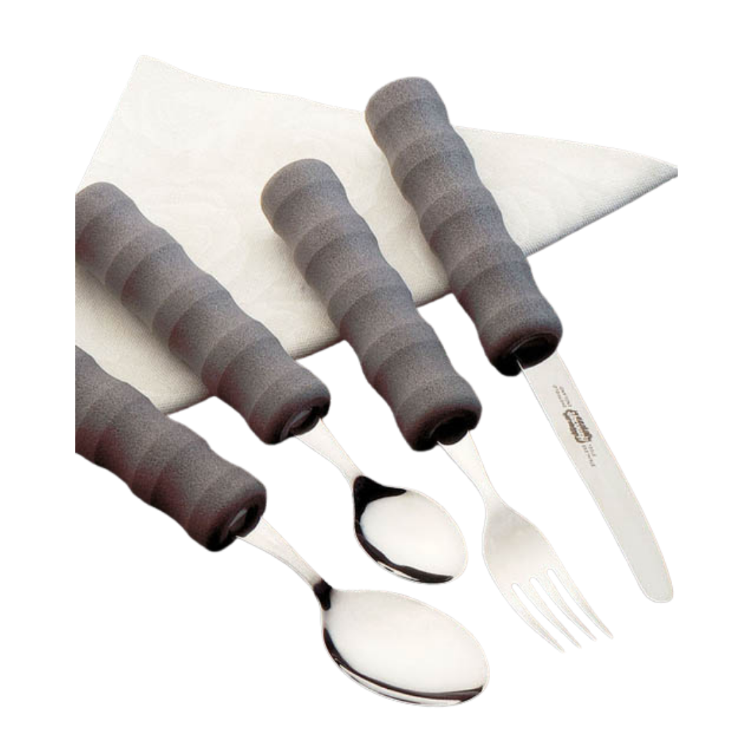The Homecraft Lightweight Foam Standard Cutlery includes stainless steel utensils fitted into soft closed-cell foam handles to support those with limited hand strength or coordination challenges.