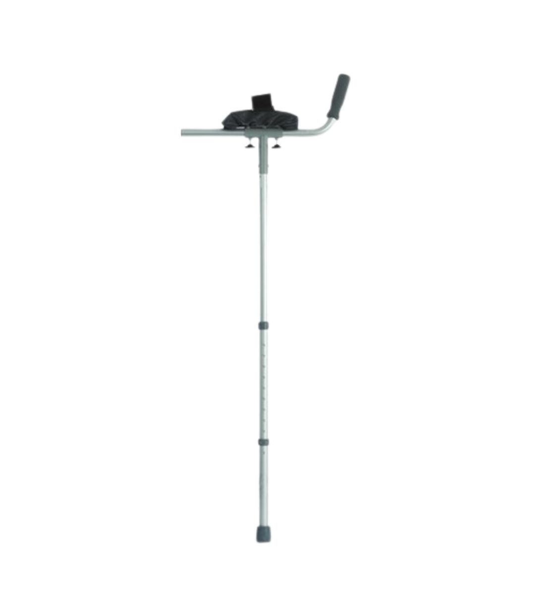 This crutch features a padded forearm trough that distributes weight over a larger area, reducing pressure on the hands and wrists. The design is tailored to assist those with limited grip strength, offering a more comfortable mobility aid. The telescopic handle can rotate 360° and locks securely to suit individual length requirements. This adjustability ensures optimal positioning for user comfort and stability.