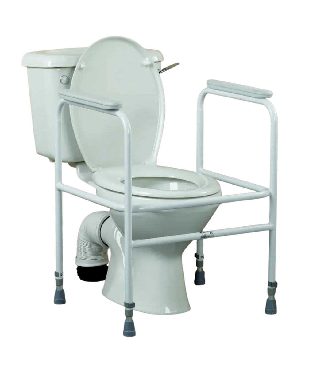 Height-adjustable legs allow the rail height to be tailored to individual needs, promoting comfort and security during toilet transfers.