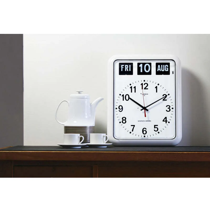 The Jadco Analogue Calendar Wall Clock pairs a 30 cm analogue clock face with a flip-style day, date and month display. This format helps maintain orientation for people with memory loss, low vision or cognitive challenges.