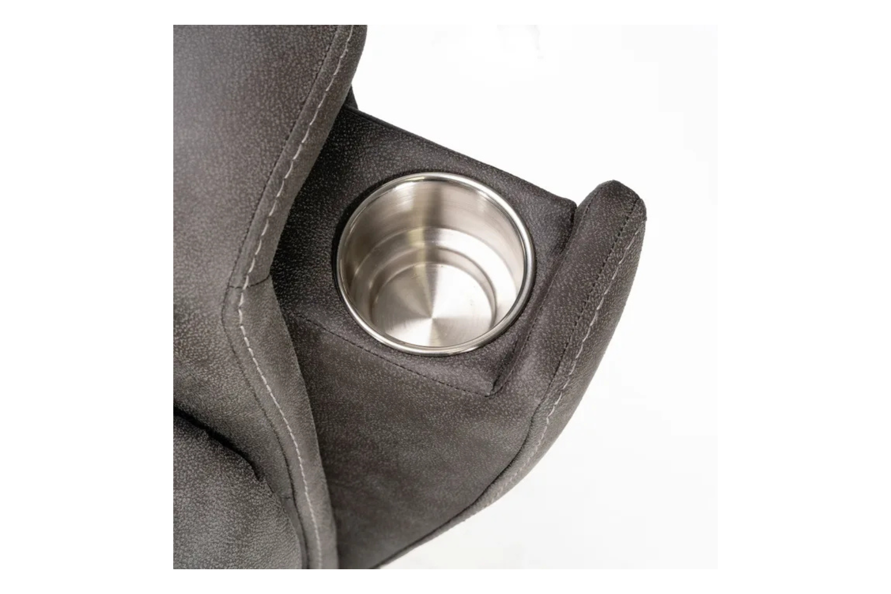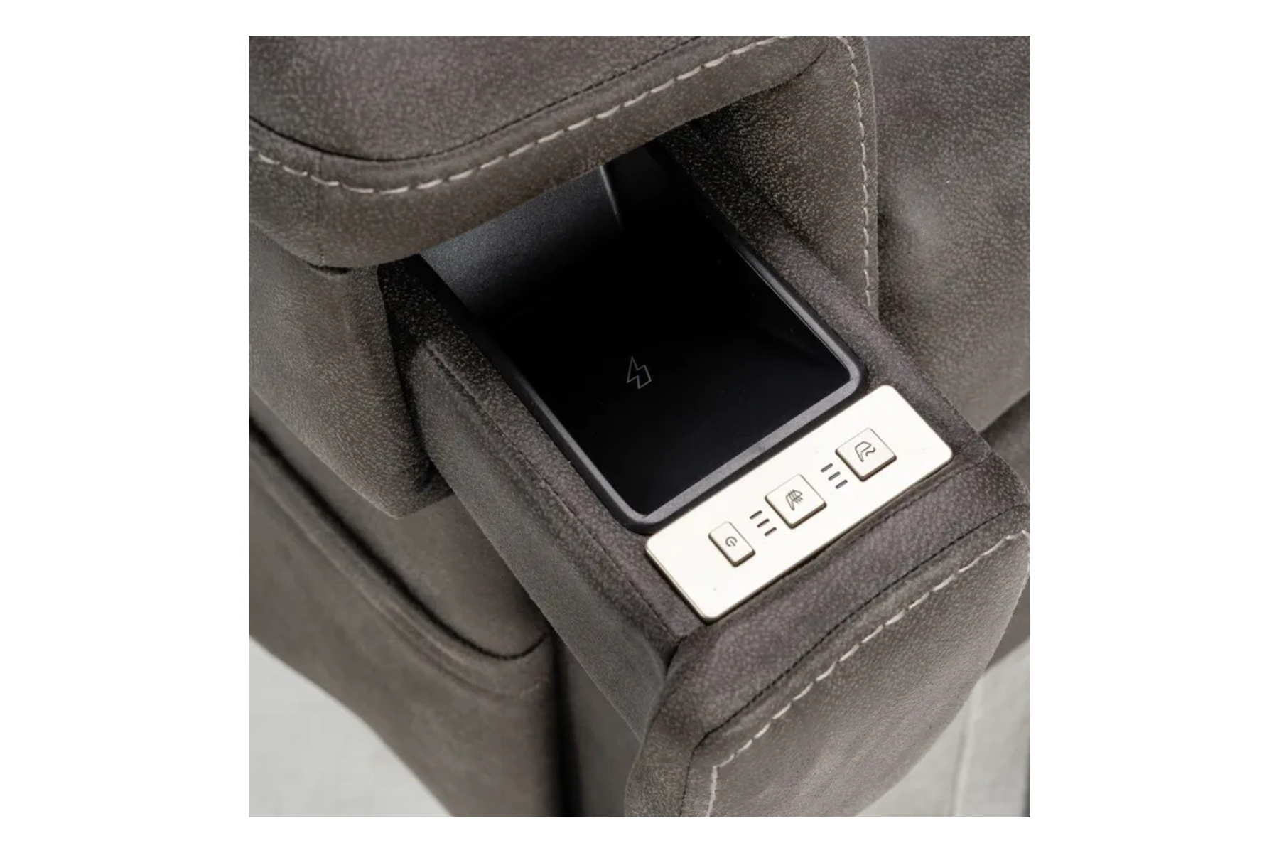The chair also includes modern conveniences such as a premium airline-style headrest, a retractable drink holder on the left side, and a wireless phone charging panel with heat and massage controls on the right.