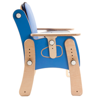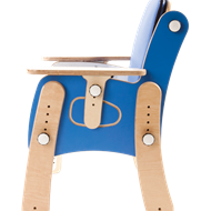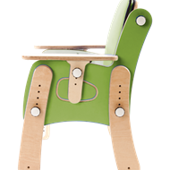 The Pal seat features a two-point lap belt and side pads for lateral stability. The armrests, legs, and footplate are height adjustable, allowing for a customised fit. The seat is available in two bright colours and made of wipe-clean fabric.