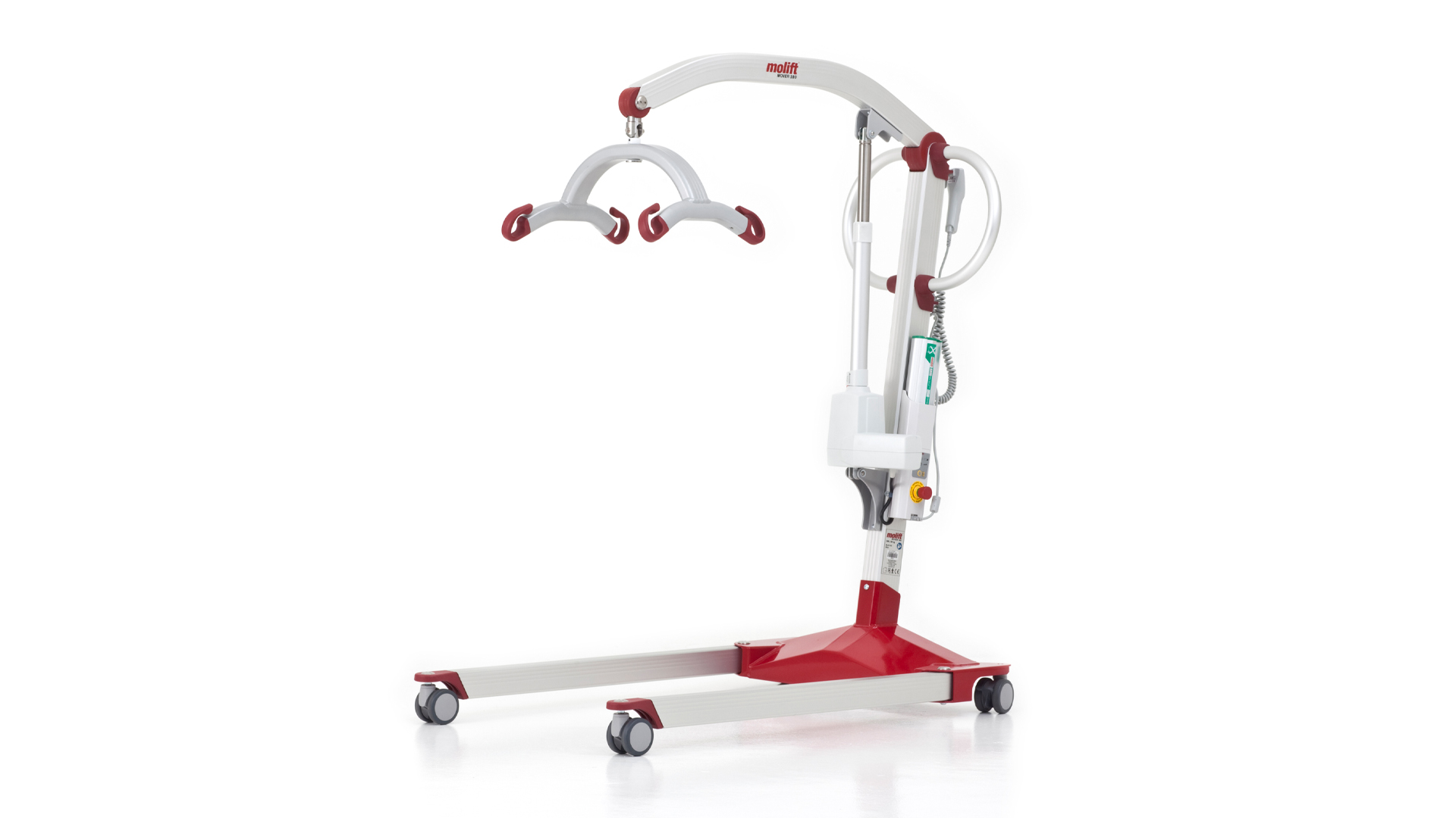 The ergonomic push bar handle offers multiple grip positions, improving carer comfort and control during operation. Its broad lifting range makes it suitable for various transfers, including floor recovery and high-surface lifts. The Mover 180 comes standard with a four-point sling bar, promoting comfort and optimal positioning.