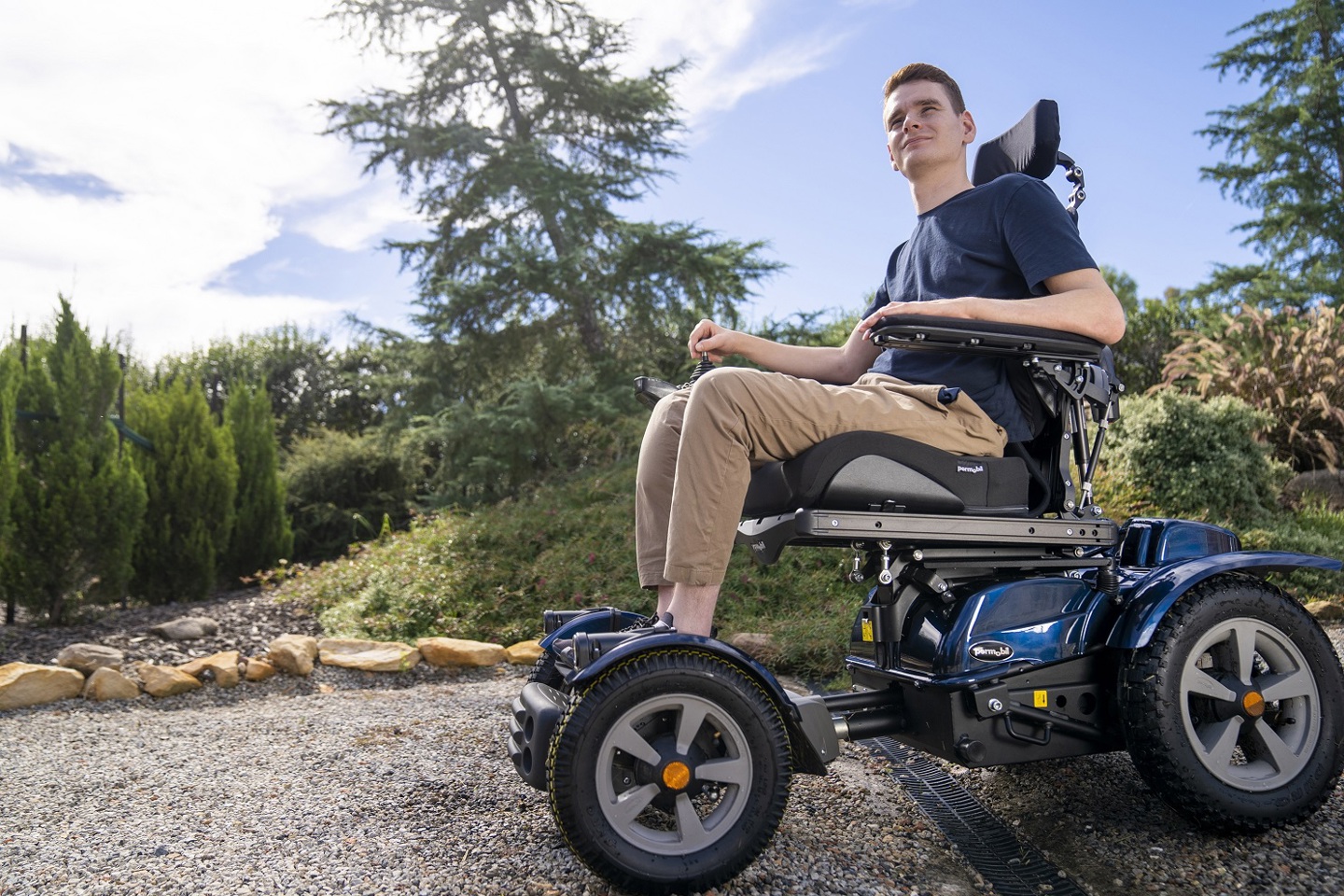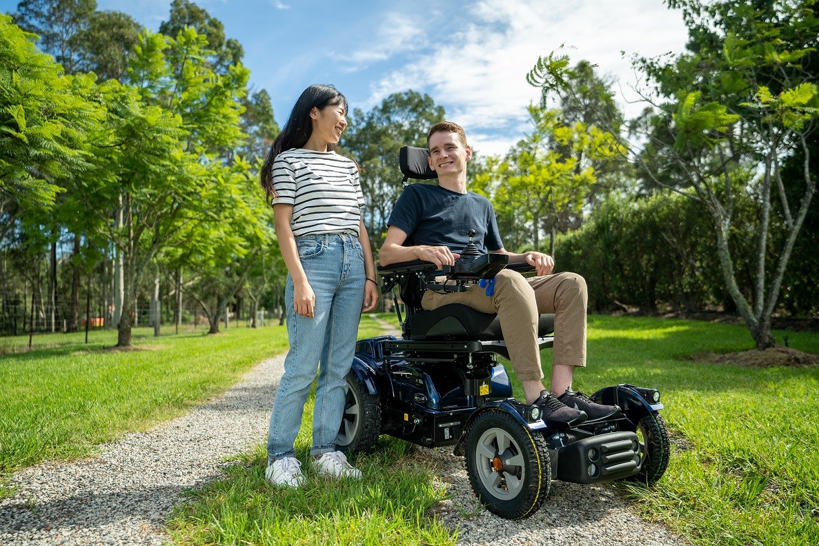 Heavy-duty drive wheels and large castors ensure clearance and durability over varied terrain. The seating frame is adjustable for width, depth and backrest height, supporting a customised fit.
