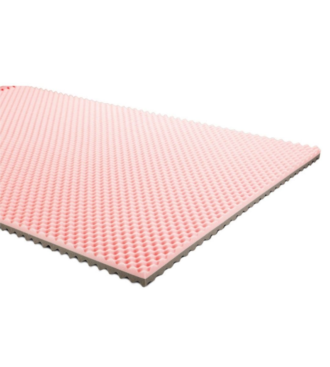 It features a dual-layer construction. The low-density pink memory foam top layer supports weight distribution and maintains comfort. The high-density grey foam base layer provides structural support and stability.