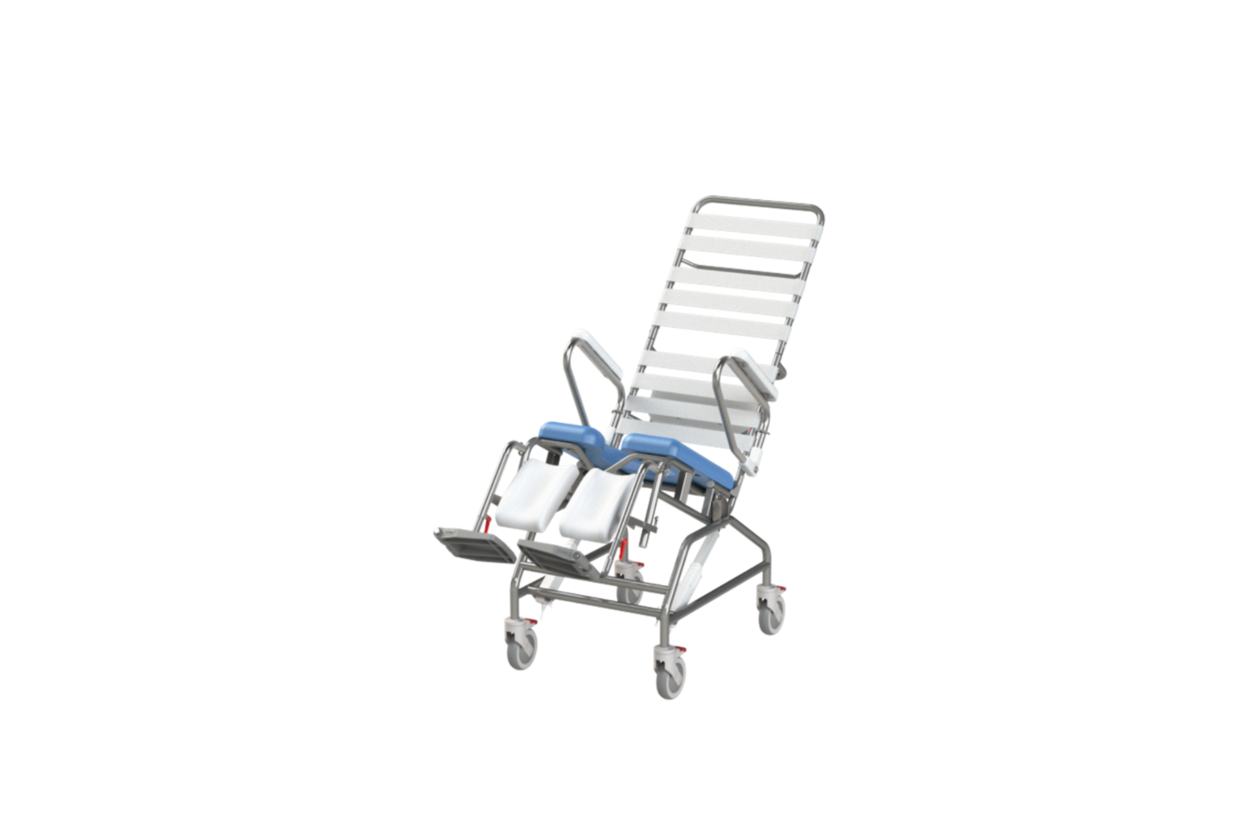 The KCare Transit Tilting Shower Commode features a gas-assisted tilt-in-space mechanism that allows smooth, safe recline during hygiene routines. Its stainless-steel frame is corrosion-resistant, ensuring long-term use in wet environments.
