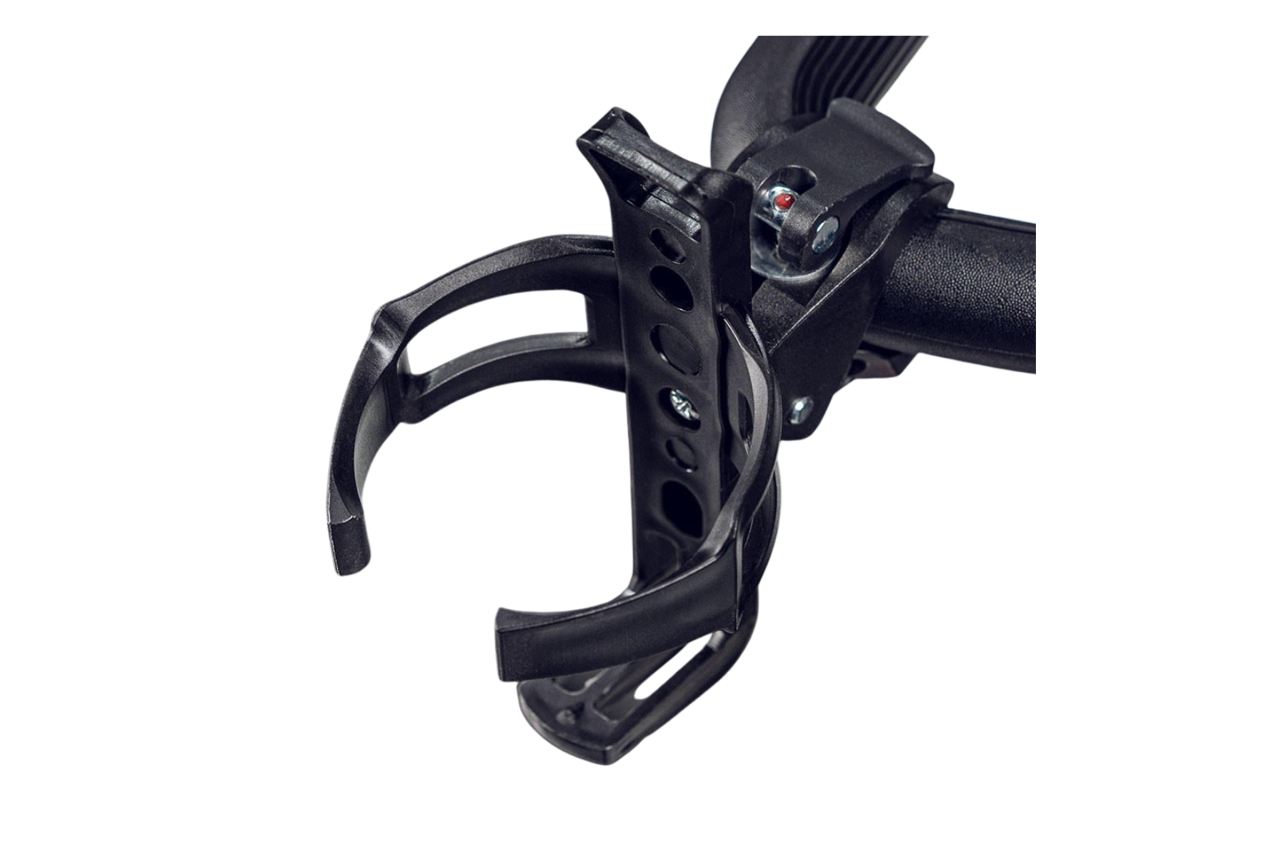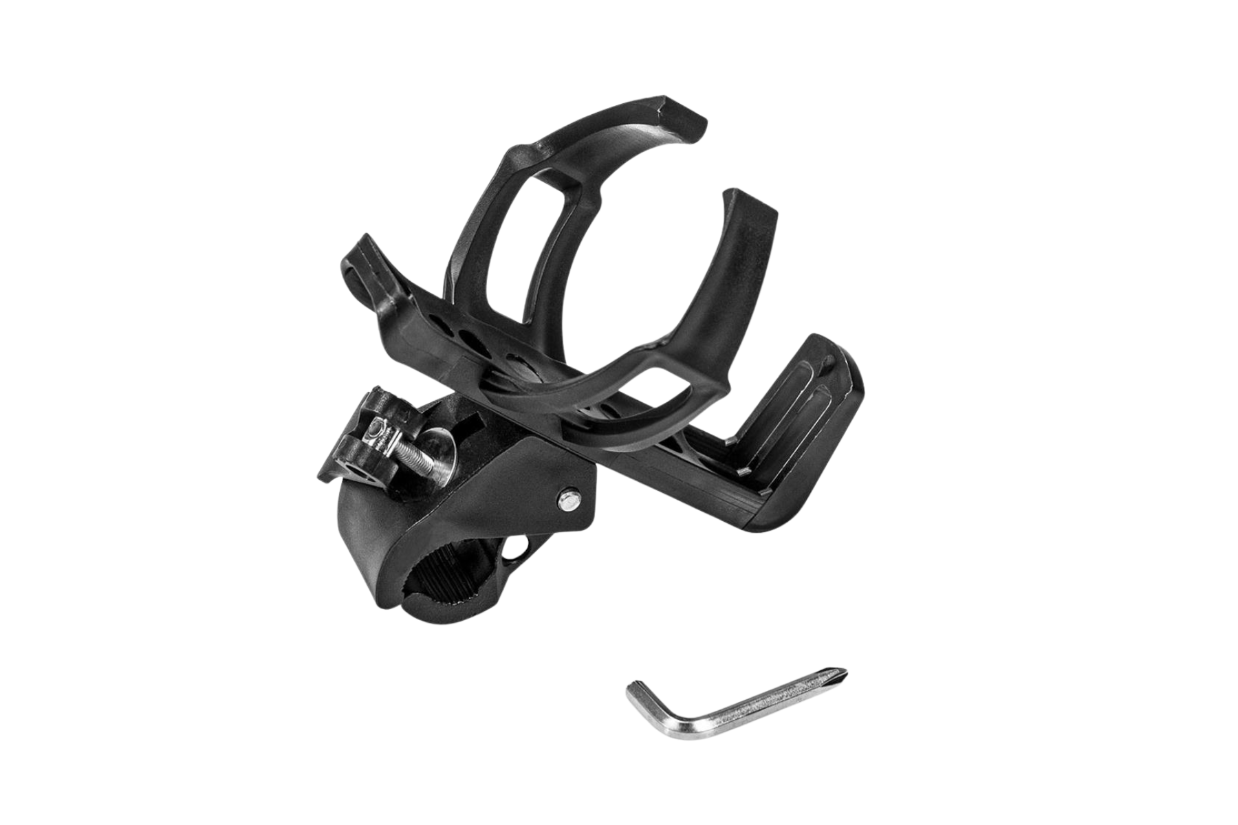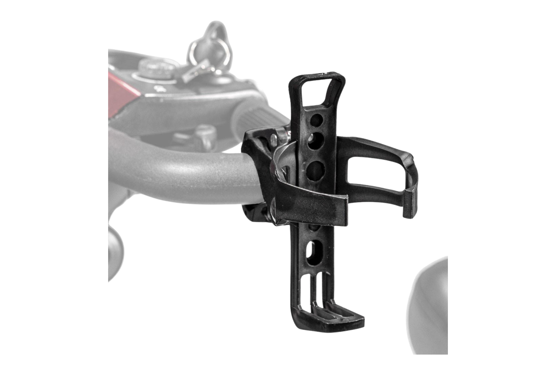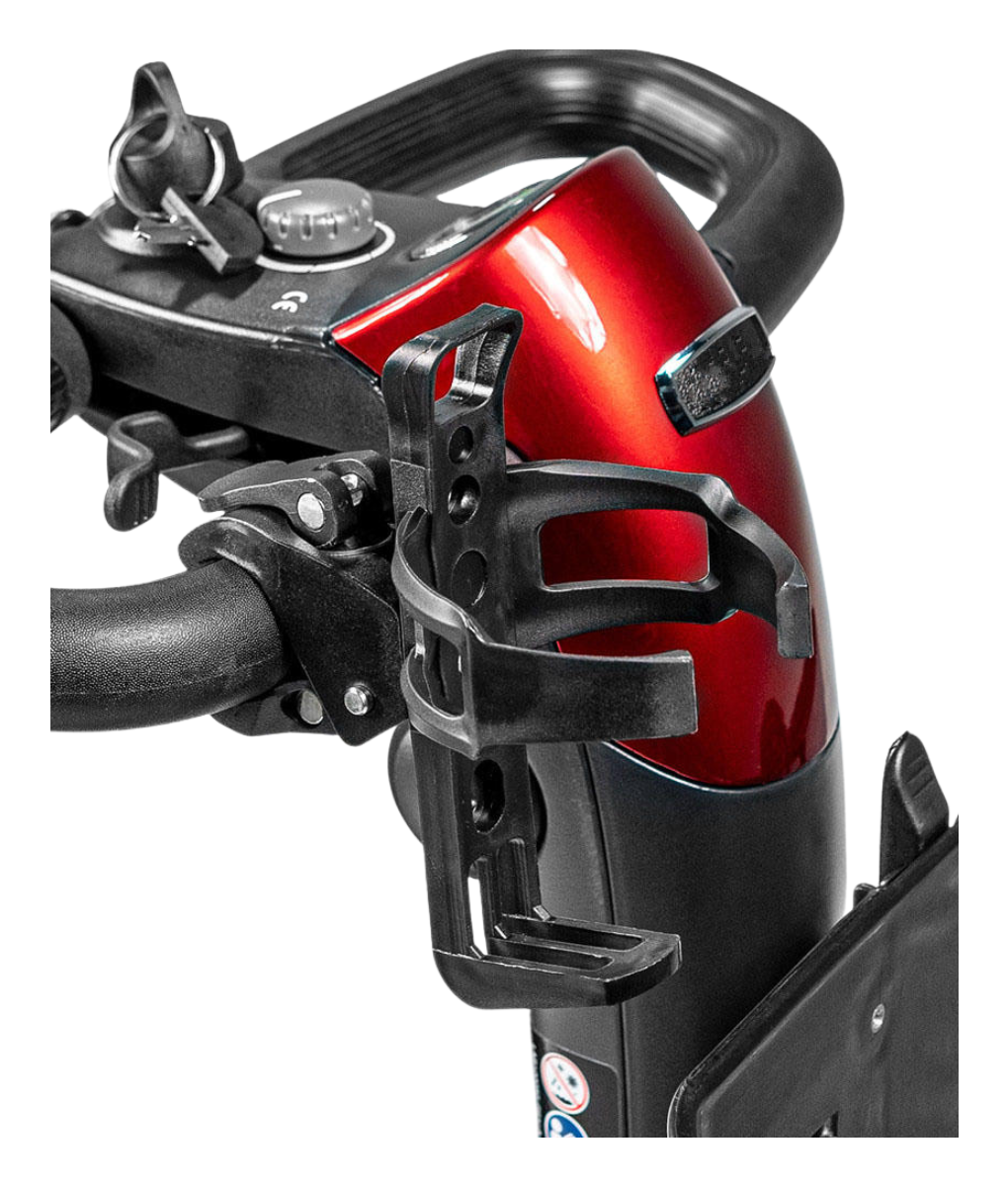 This cup holder is designed to mount to cylindrical style handlebars. It holds drinks in place while the scooter is in motion, reducing the risk of spills and keeping hands free for safe driving.
